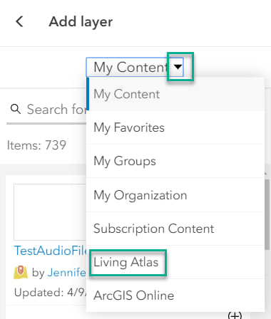 b. Point to the drop-down and select Living Atlas. ArcGIS Living Atlas of the World contains thousands of trustworthy and curated layers such as demographic, environmental, and infrastructure layers.