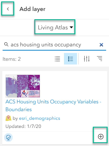 c. Go to the search box and type “acs housing units occupancy”. This is a US Census Bureau layer that is automatically updated every year. Click the Add icon (the plus sign) to add the ACS Housing Units Occupancy Variables—Boundaries layer. Click the Back button next to Add Layer to return to the Layers panel.
