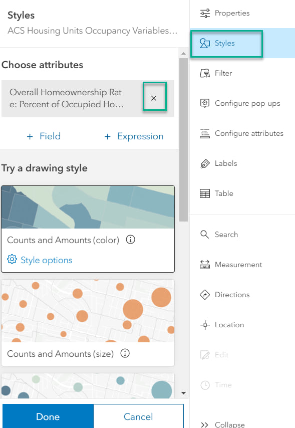 a. Click the Styles button to open the Styles panel. Currently, the map is styled using the percentage of owner-occupied houses. Click the x next to the variable name Overall Homeownership Rate: Percent of Occupied Housing Units that are Owner-Occupied.