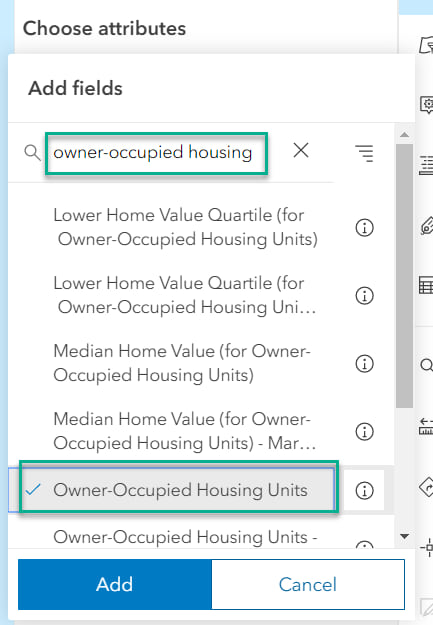 d. Change the word “owner” in the search box to “renter” and select Renter-Occupied Housing Units. Lastly, clear the search box, type “vacant housing”, and select Vacant Housing Units. Then click Add.