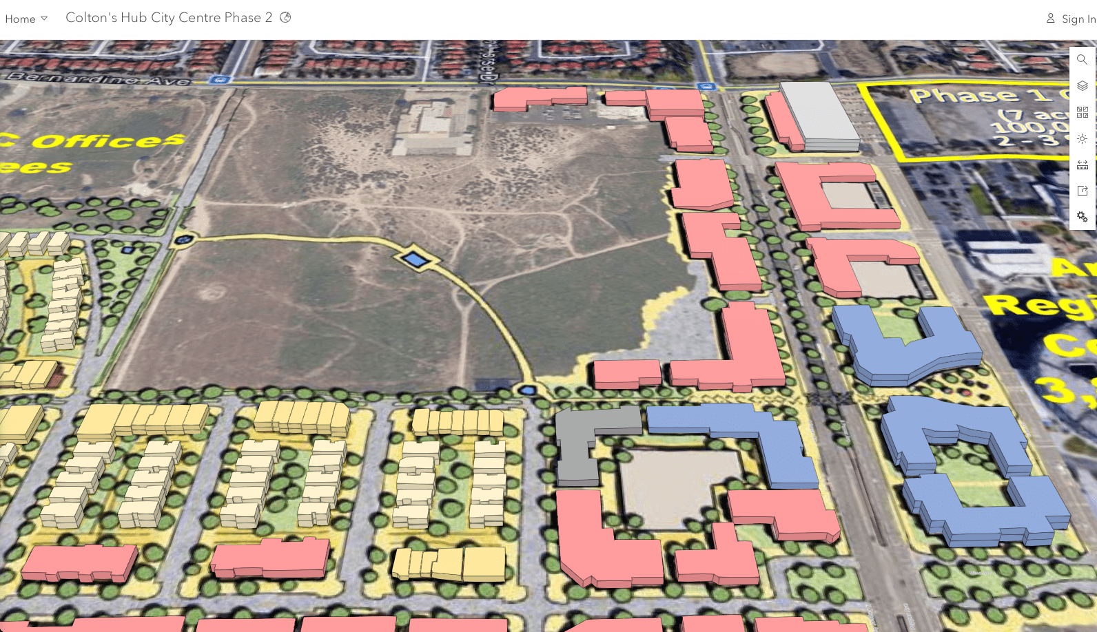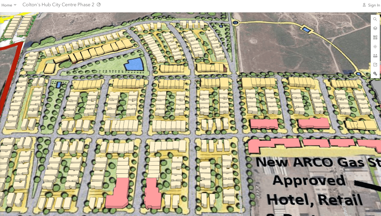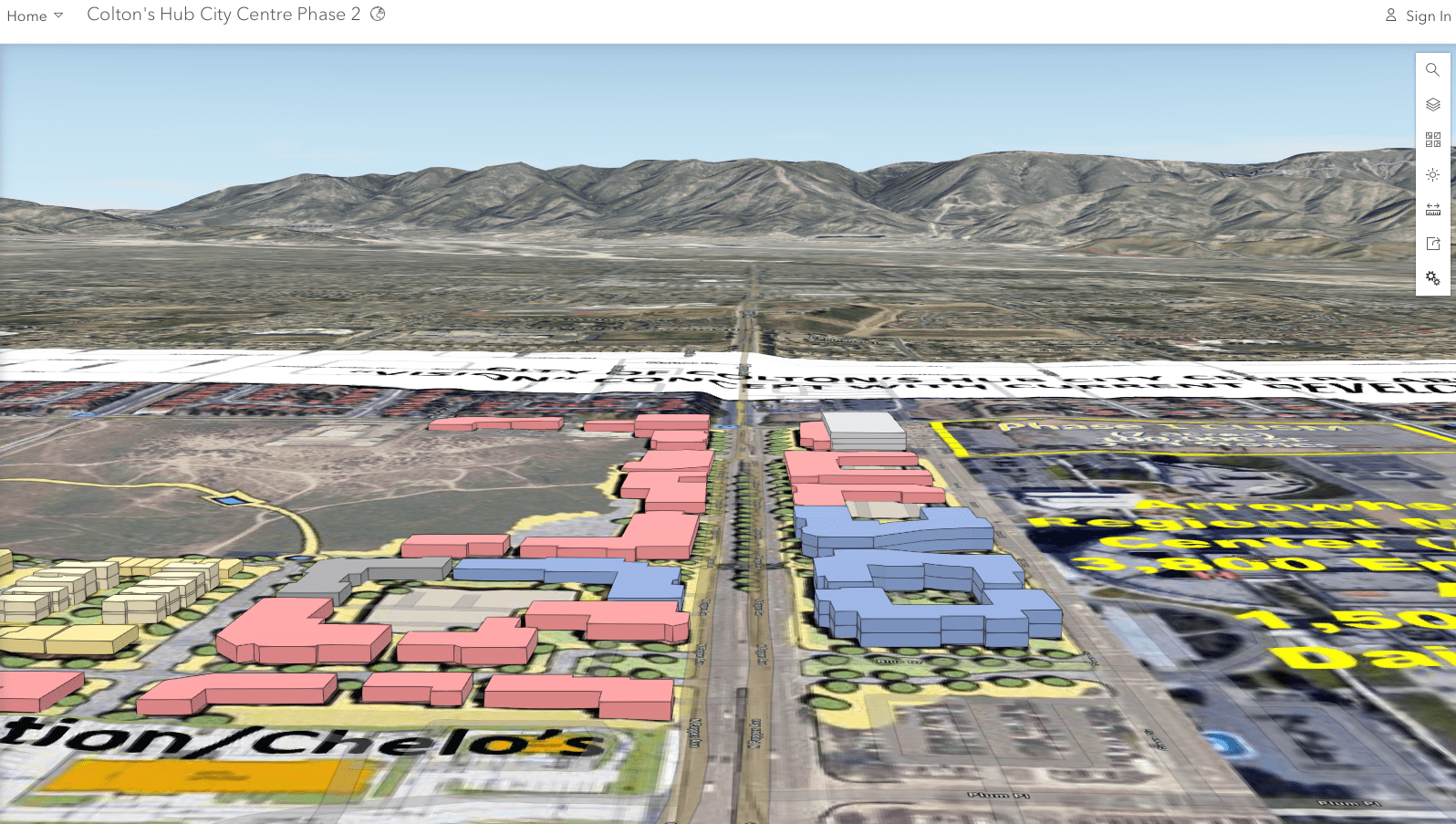 Morgan’s team members knew they had to harness this shared vision to attract developers to Colton. Using the smart city planning software ArcGIS Urban, they built a 3D model of planned and existing development at the center, demonstrating how the mostly barren land could flourish into a lively community space. By creating a digital twin of Colton, the team could visualize the Hub City Centre plan with the proposed additions of housing, nature trails, restaurants, entertainment, parking, and other features.