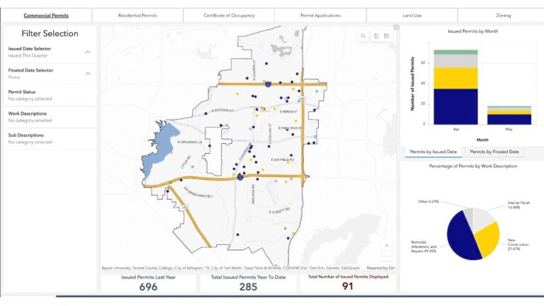 Development Dashboard—Using an interactive map of Arlington, a person can pinpoint information about all commercial permits, residential permits, certificates of occupancy, permit applications, land-use information, and zoning based on the location of the project.