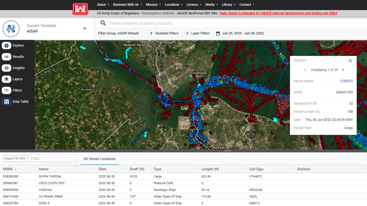 “We’ve got hundreds of dredge locations nationwide, and we need a tool like NavPortal to be our early-warning indicator,” said Ned Mitchell, a research civil engineer at the US Army Engineer Research and Development Center and NavPortal product manager. “We need to see the worst trouble spots forming before they become full-blown emergencies.”