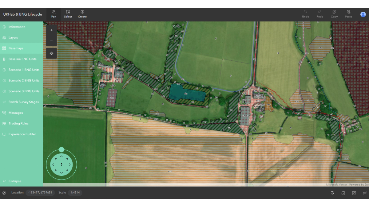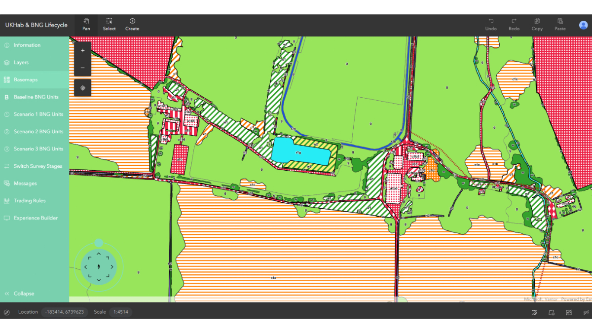 On-screen, each habitat type appears in coded color. Baseline conditions sit alongside post development scenarios, monitoring data and project management layers—and every edit updates the picture in real time.