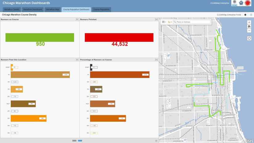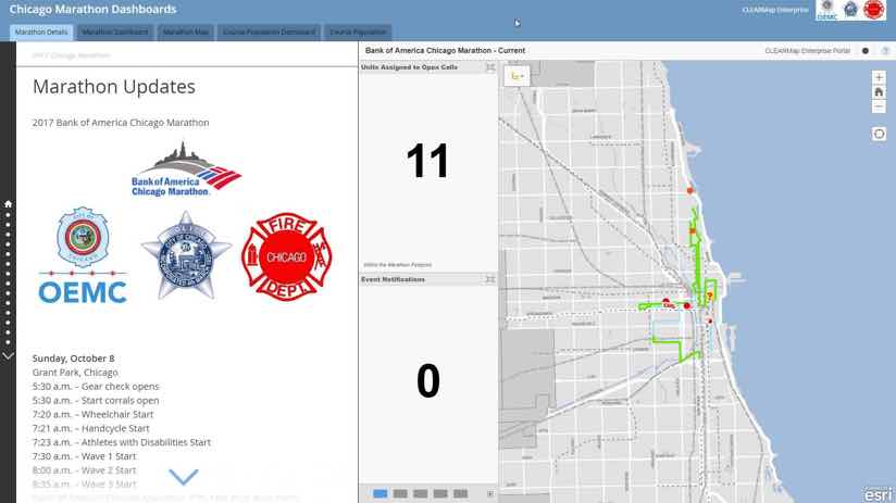 Chicago’s Office of Emergency Management and Communications (OEMC) added runner locations to their shared map by linking to live data from the timing mats on the course that collect data from the RFID chips each runner wears. This was made possible via a partnership with Bank of America that provided key course details and helped the city coordinate with a chip time vendor and Esri Professional Services to make this happen.