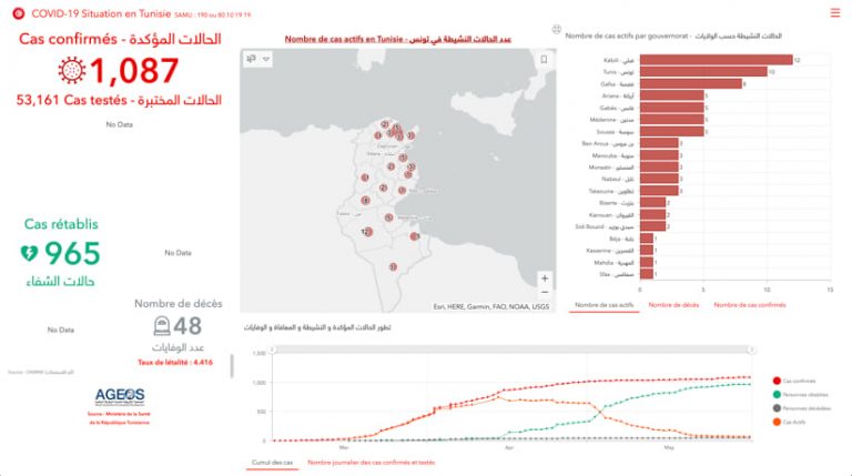 In Tunisia, the Ministry of Public Health built a georeferenced database of hospital bed capacity, necessary medical equipment (including functional respirators and monitors, syringe pumps, and personal protective equipment), and the number of corresponding medical staff. The team worked with Esri distributor, Graphtech, and the African Association for Geospatial Development (AGEOS) to create maps for real-time monitoring of resources, featured on the Tunisian Ministry of Public Health’s website. They also created maps to connect residents with essential services.
