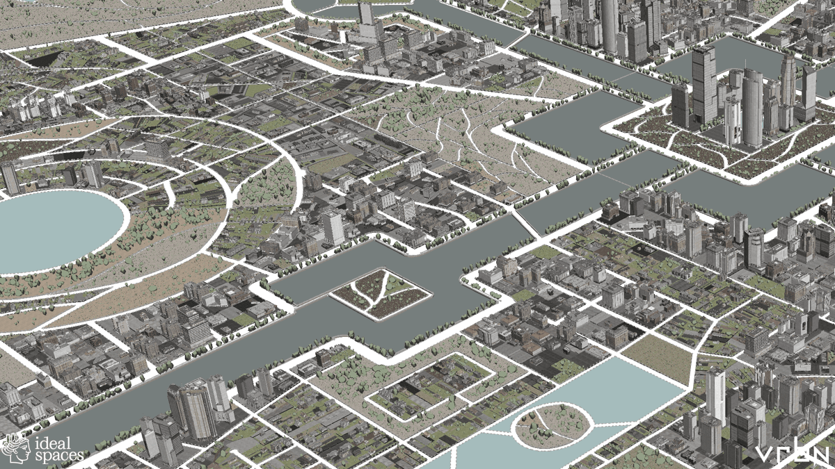 Two years later, as part of ISWG’s Artificial Natures exhibition at the Biennale, vrbn constructed multiple interactive 3D models of cities. Some were based on real planning projects, such as Patrick Geddes’s 1935 plan for Tel Aviv, an exemplar of the garden city movement. Others were imagined or imaginary. These included Sforzinda, a never-realized Renaissance utopian city imagined by Italian architect Filarete in the 15th century.