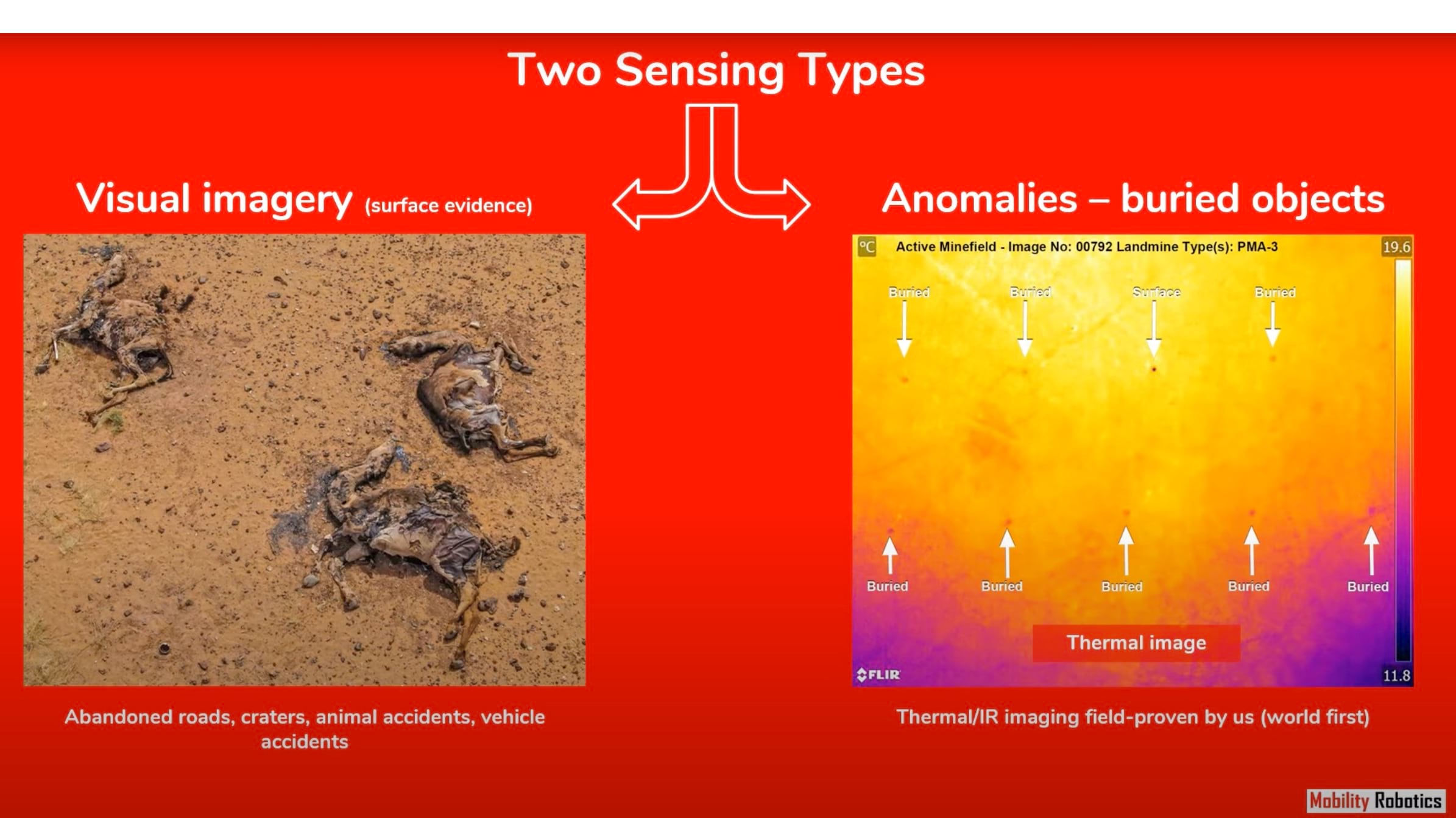 This thermal imaging method exploits the different heat retention properties of mines, compared to the surrounding sand. Plastic mines create a cool patch during the day and a hot patch at night, while metal mines do the opposite.