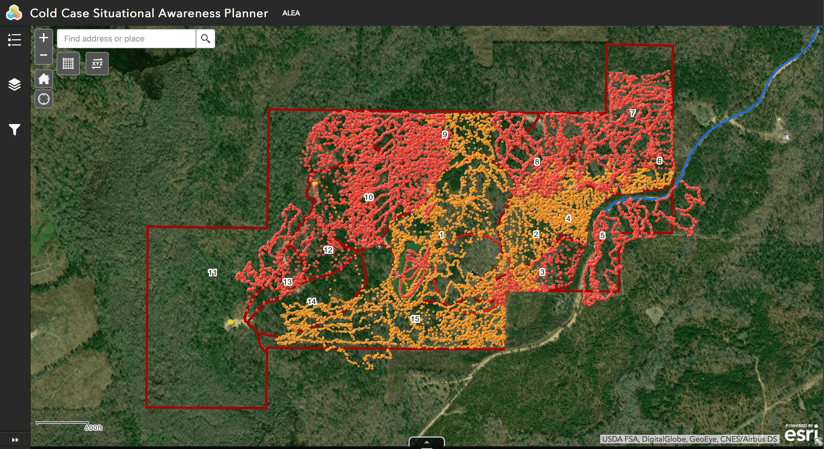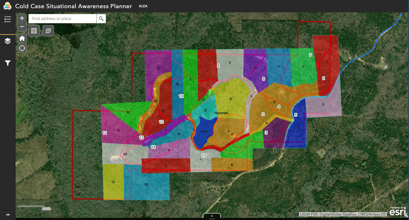 “Our initial involvement centered on gathering aerial imagery for when this incident took place and to show change over time,” said Jared Bostic, deputy Geographic Information Officer for the state of Alabama. “The more we learned about the investigation, and what the case agent was trying to achieve, the more we talked about using the real-time capabilities of GIS to track the search as it unfolded.”