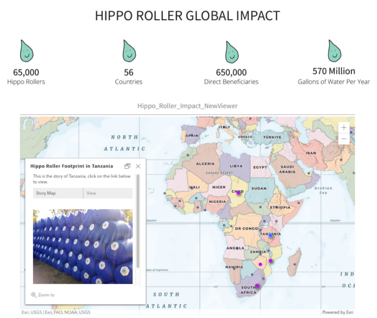 Built using ArcGIS Hub, the site aggregates data, photos, videos, and ArcGIS StoryMaps stories to illustrate the Hippo Roller’s impact around the world. Visitors can watch informative videos, read statistics about water scarcity and access, explore interactive stories by country, and donate to the campaign to distribute Hippo Rollers.