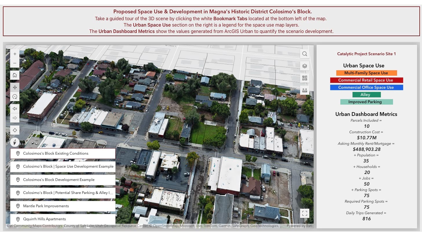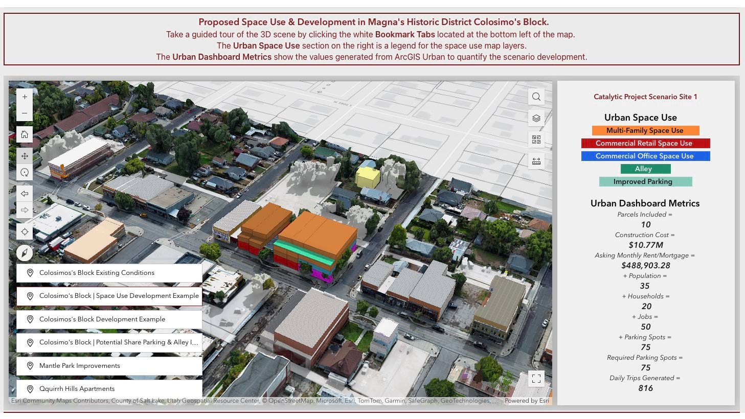 They integrated the 3D with other critical details into a website that highlights Magna’s Historic District Revival Plan. MSD used Site Scan for ArcGIS for drone imagery capture and processing and ArcGIS Experience Builder to guide visitors through the 3D scene.