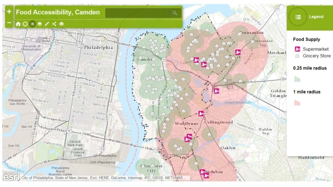 Pena gravitated to GIS in part because she felt the results of her analysis could inspire change. For example, she learned to use ArcGIS StoryMaps—an interactive online platform that combines maps, videos, and digital media—to identify Camden neighborhoods that lacked grocery stores. Although she knew the issue firsthand, she was surprised to discover through the map that some residents sometimes had to go to another city just to shop for food.