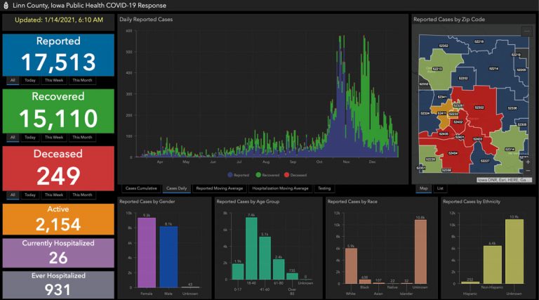Similar to the Johns Hopkins’s effort, the Linn County dashboard was to be publicly available, easy to understand, and with data streaming in near real time.