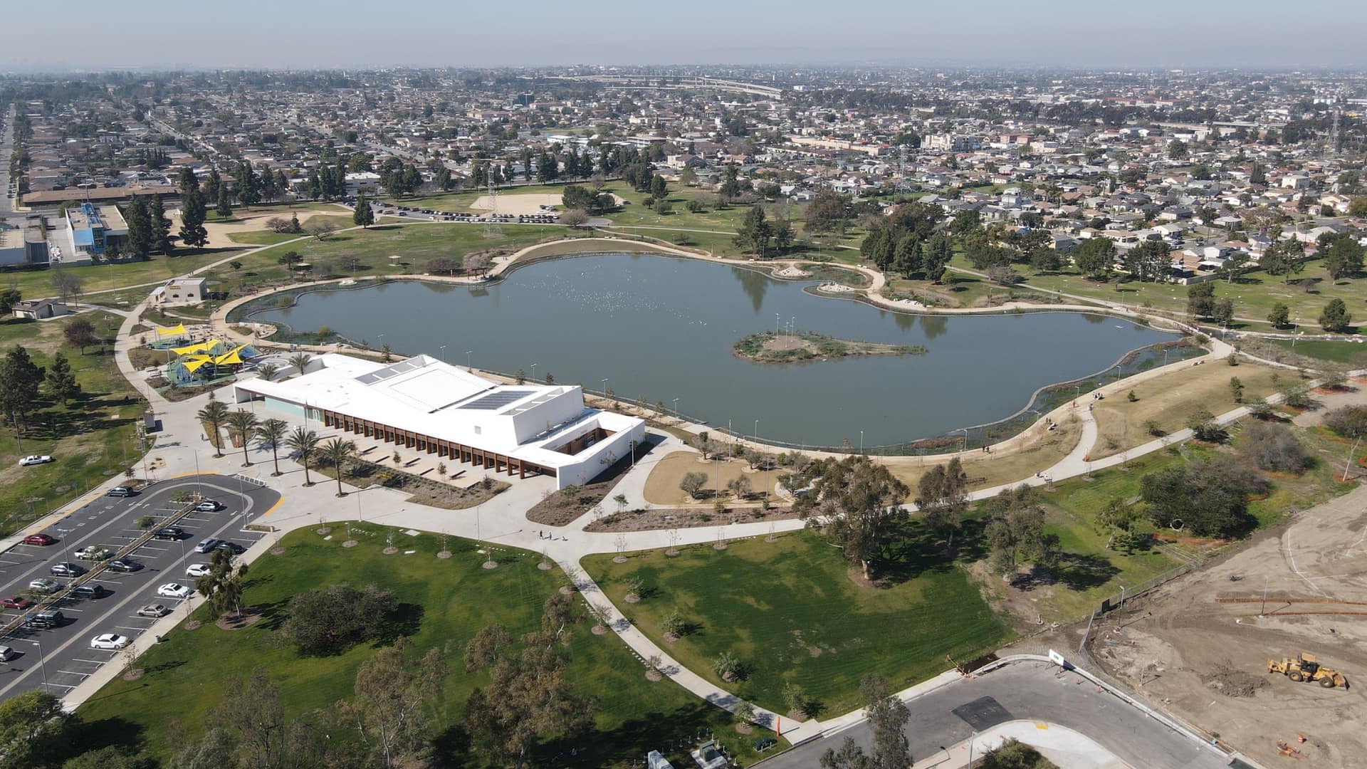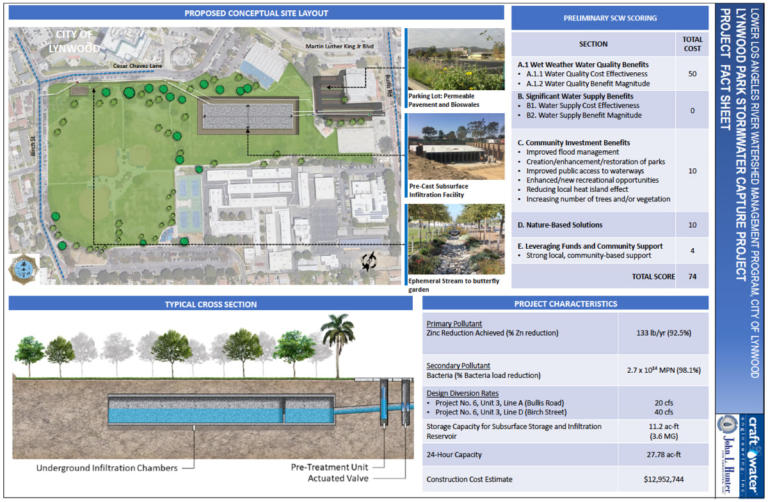 The Lynwood City Park Stormwater Capture Project enhances an existing park. It will add permeable pavement in the parking lot and an underground storage reservoir. Trees will provide shade to reduce the heat island effect and improve flood management. The restoration effort will include planting native landscapes and a butterfly garden along with two new soccer fields. The park is next to the Lynwood Youth Center and Lynwood Middle School. Educators expect to teach habitat restoration, water conservation, erosion control, and stormwater management. The $12.9 million restoration and water management project will capture and treat 647 acre-feet of stormwater.
