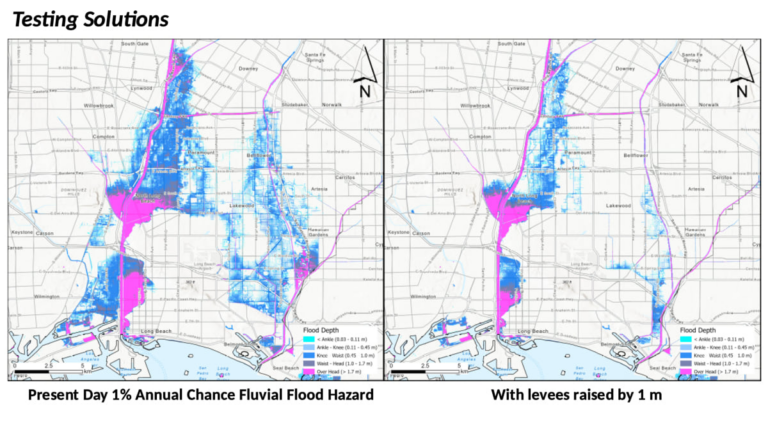 The new maps are now helping improve flood understanding in vulnerable areas, like along the LA River, and sparking fresh discussions about adaptation. The system can be updated to account for possible infrastructure projects, like new levees, channel widening, green infrastructure and even changes to land-use and building codes.