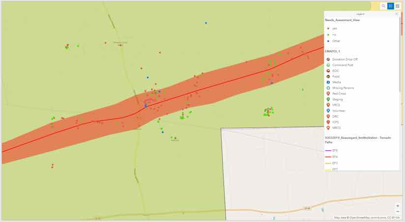 Aerial imagery from airplanes and drones provided a good deal of this information. Lee County had flown aerial imagery for the whole region within the past year. Along with after-tornado imagery, the before photos provided a good side-by-side comparison of the extent of damage. The National Insurance Crime Bureau’s Geospatial Intelligence Center(GIC) collected the first after-tornado aerial imagery in the wake of the event, and made that imagery available to first responders.