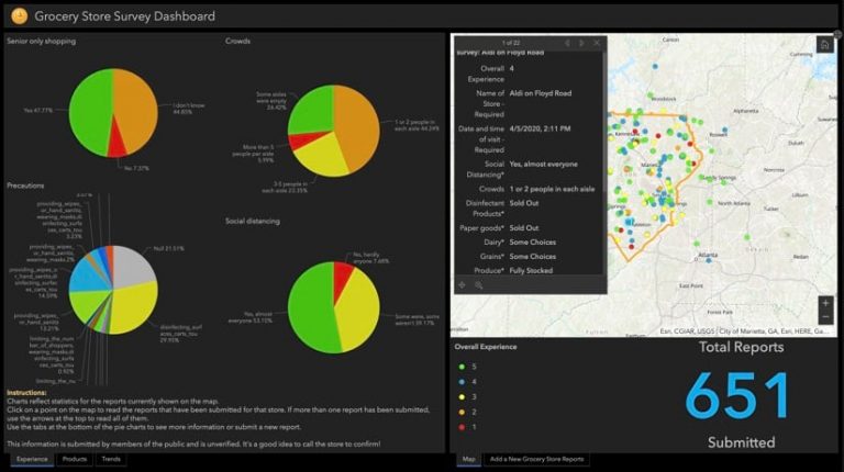 The Cobb County Grocery Store Survey Dashboard combines all inputs for an overview of shopper sentiment, what’s in stock, and how patterns are trending over time. More than 650 reports were entered within the first week, showing the power of crowdsourcing data in times of crisis.
