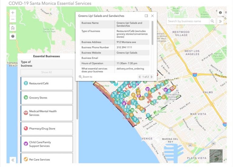 In Santa Monica, city officials responded by setting up an online survey for business owners to communicate essential services and restaurants on a map. Survey results are processed twice daily to provide a dynamic up-to-date map. Santa Monica residents can search the map by name or business type.