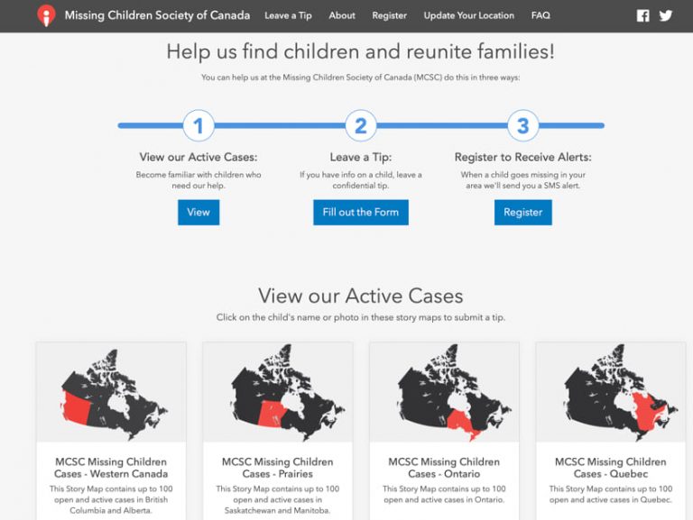 Staff at MCSC teamed with developers from Esri Canada to create a web-based mapping app called MCSC rescu that uses Esri’s ArcGIS Hub technology to help reunite children with their families. Visitors to the app can see all active cases, with photos and details of children mapped to their last known location. The site includes a form that allows anyone to leave a confidential tip, including adding photos. It also provides a registry that people can join to receive an SMS alert directly from police if a child goes missing in their area.