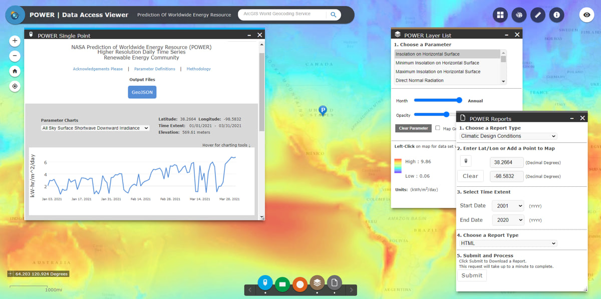 The POWER team provides the Data Access Viewer, a GIS web-based tool that allows anyone to see and explore a variety of renewable energy variables at any location around the world. Software developers can connect directly to the application programming interface (API) and use the data within the applications they build, and cartographers or other GIS professionals can use ArcGIS image services to conduct analysis, make smart maps, and create dashboards—all of which roll up to effective renewable energy plans.