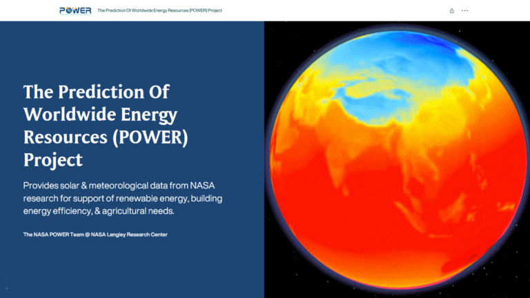 Through its Prediction of Worldwide Energy Resources (POWER) project, NASA provides interactive maps, applications, and data services that describe meteorological conditions and solar radiation and show how those resources may be changing over time. The majority of data products are updated on a daily basis, and historical records stretch back over 35 years. Decision-makers across industries can access the data inside their own applications to visualize on a map, perform analytics, and employ calculations to enhance planning and problem-solving.