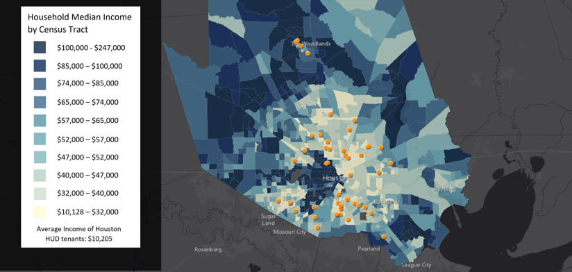 On a map, it’s easy to see why there’s such a stark contrast in residents’ experiences. Houston’s race and wealth maps are nearly identical, with a clear, arrow-shaped patch of White, high-income residents on the east side of downtown. Forty out of Houston’s 43 Section 8 apartment complexes are located outside this area in low-income, Black- and Latinx-majority communities.