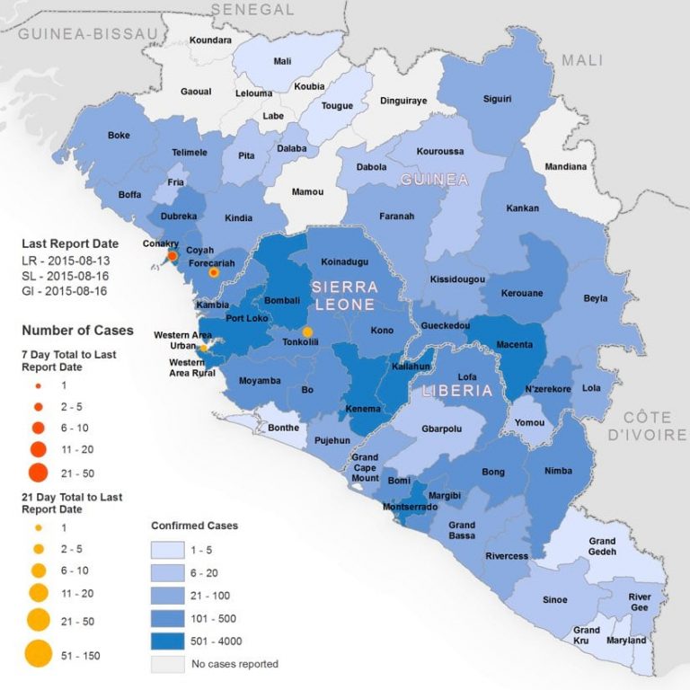 During the 2013 to 2016 Ebola crisis, health and government agencies used GIS to understand the virus, determine its causes and origin, and trace how it travels. Spread through contact with bodily fluids such as blood, Ebola causes severe bleeding and organ failure, and is often fatal. To help fight the outbreak, which marked the first time the disease spread across multiple international boundaries, the WHO published live maps of confirmed cases in Sub-Saharan Africa.