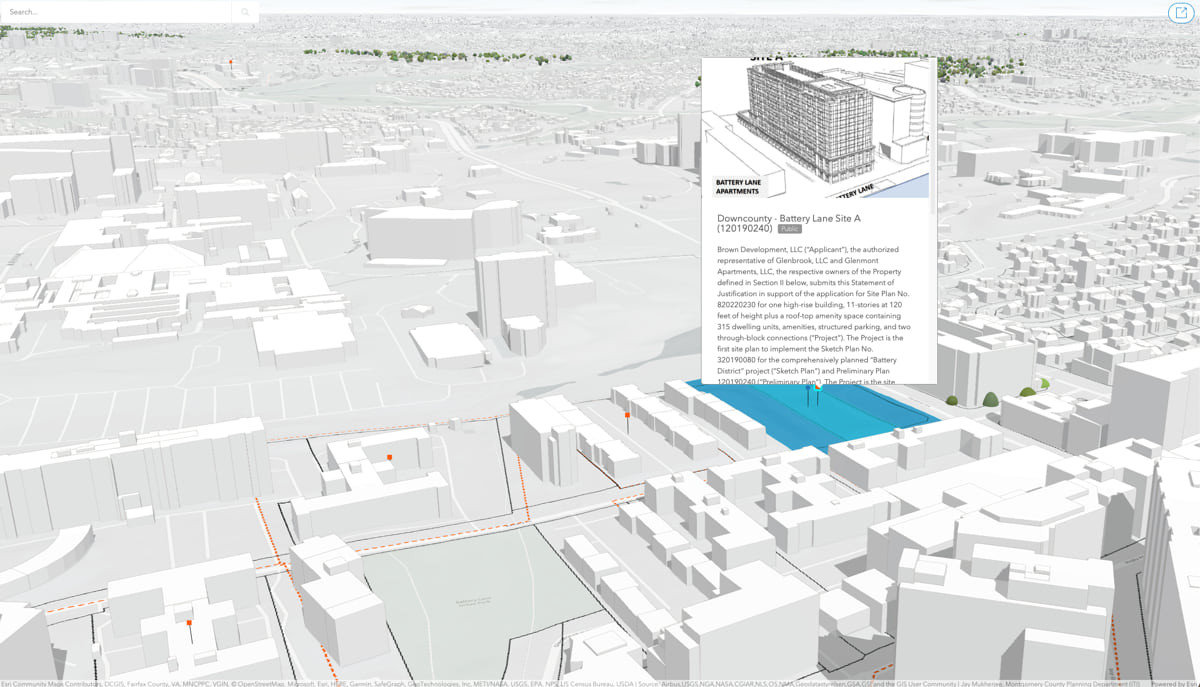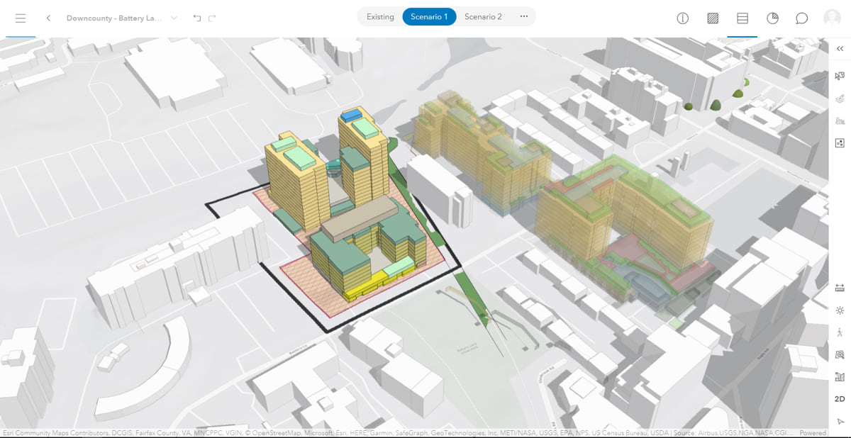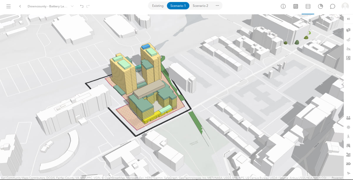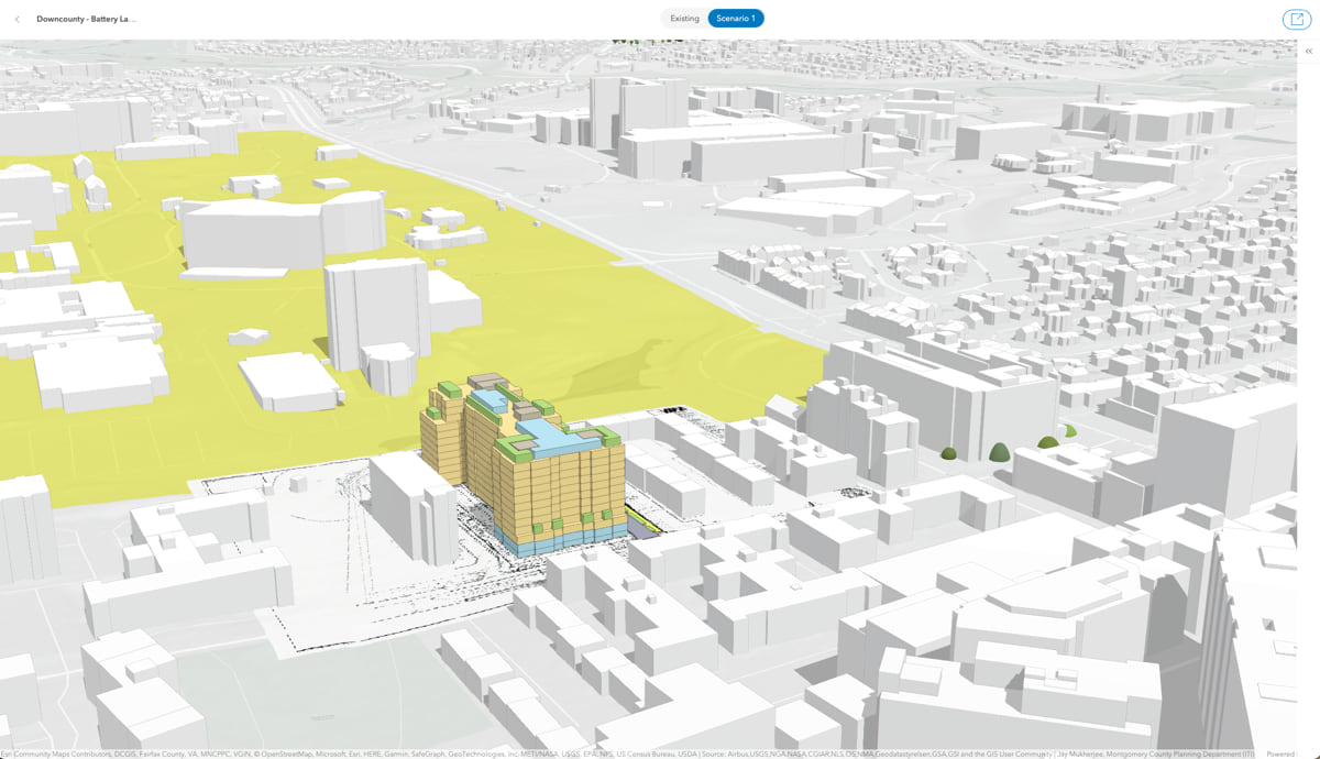 Mukherjee and O’Quinn used ArcGIS Urban to build a model of a proposed high-density housing development on Battery Lane, just south of the National Institutes of Health’s (NIH) 300-acre campus in Bethesda. The new 10-story luxury apartment building will offer far more housing than the postwar three-story apartment buildings it will replace. O’Quinn and her colleagues posit that some of NIH’s 18,000 employees will want to live there.
