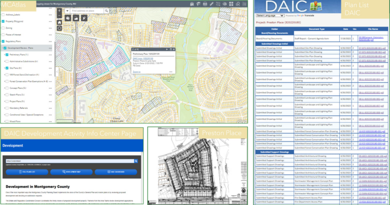 The department has used digital tools to inform the public for years. The Development Activity Information Center (DAIC) indexes project descriptions, maps, drawings, and other information. The MCATLAS map viewer displays related data—county and election boundaries, priority funding areas, and opportunity zones. An interactive Development Activity map outlines developments by type and tracks progress.