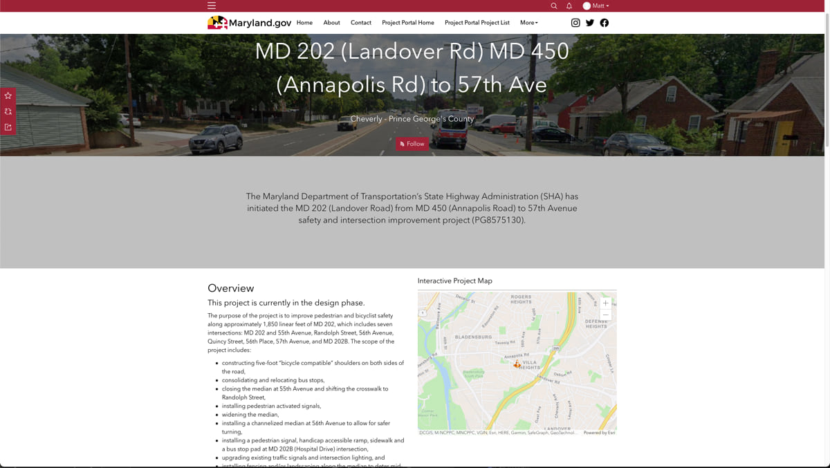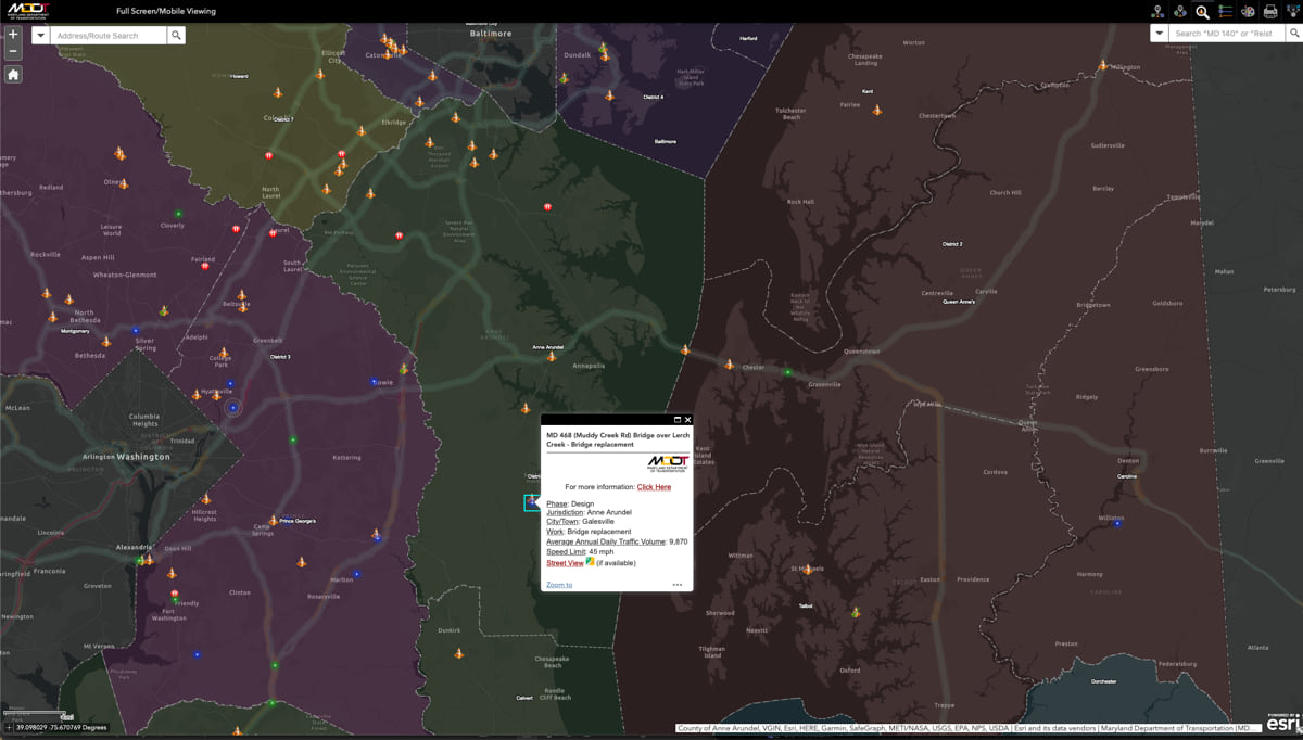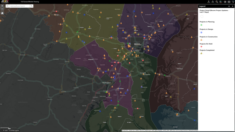 Officials in Maryland share infrastructure project news and details with the state’s six million residents on the Maryland Department of Transportation State Highway Administration’s (MDOT SHA) Project Portal. The site uses geographic information system (GIS) technology to enhance transparency and improve internal staff communications with location-specific data.