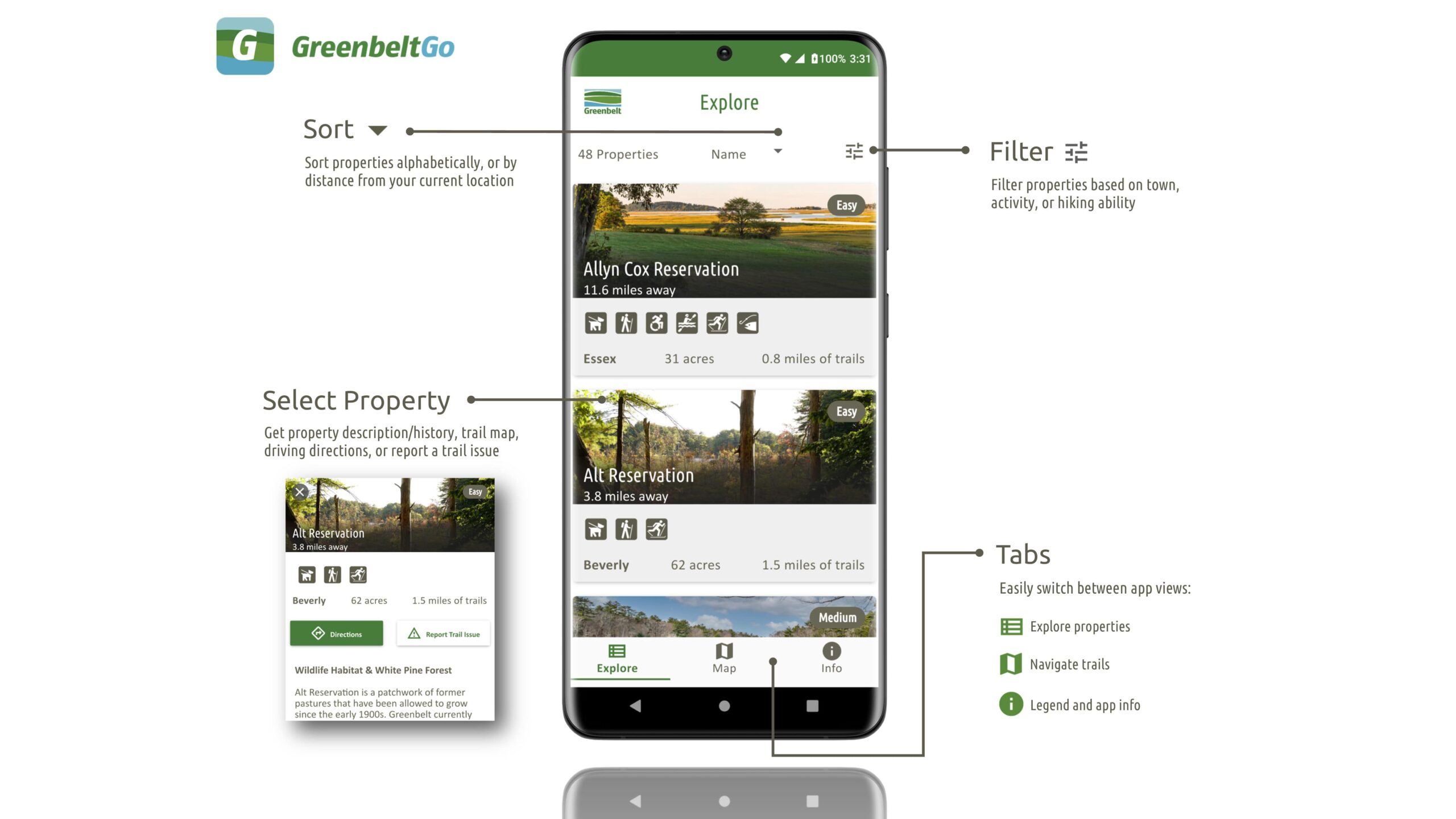 GreenbeltGo was released on February 14, 2022, covering 49 protected properties as well as state owned properties such as Bradley Palmer and Maudslay State Parks, with plans in place to expand to additional areas in the future. People can plan their visits by type of activity, proximity to their community, and degree of hiking experience. Via an interactive map, users can explore points of interest and elevation contours, access up-to-date information on trail conditions, and track their locations on the trails live as they go. They can download offline maps if desired, and receive notifications on upcoming outreach and educational events organized by Greenbelt.