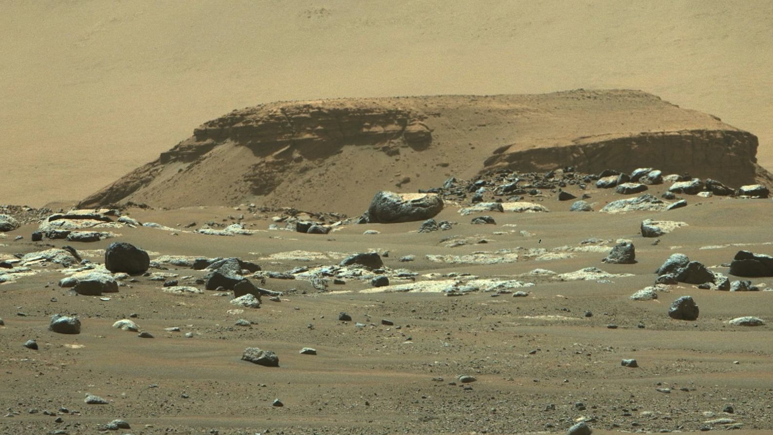 For the Mars 2020 mission, the team chose the Jezero crater because it was geologically interesting. It looks as if water carved a valley through the crater rim and filled the crater with a lake, depositing sediments in a river delta made up of clays and various rocks clumped near the inlet. Given Jezero’s past watery environment, scientists hope the sediments and rocks contain preserved organic molecules. The long-term mission of Perseverance is to gather rock core samples that a future mission will retrieve and return to Earth to determine if they contain the remains of life.