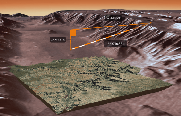 In 2005, NASA launched the Mars Reconnaissance Orbiter, with sensors that captured images that now form a new Mars basemap for GIS work. The Context Camera (CTX) on that craft provides big-picture images that span 25 miles across at six meters per pixel resolution. In 2017, the craft had captured enough images to have essentially global coverage, providing a new global basemap. The High Resolution Imaging Science Experiment (HiRISE) camera on the same orbiter captures imagery at 25 centimeters per pixel resolution, which is as fine-grained as the publicly accessible satellite imagery of Earth. At this resolution, rover wheel tracks are visible on the planet’s surface. The sensor focuses on areas of particular interest and has captured roughly 5 percent of the surface of Mars at high resolution.