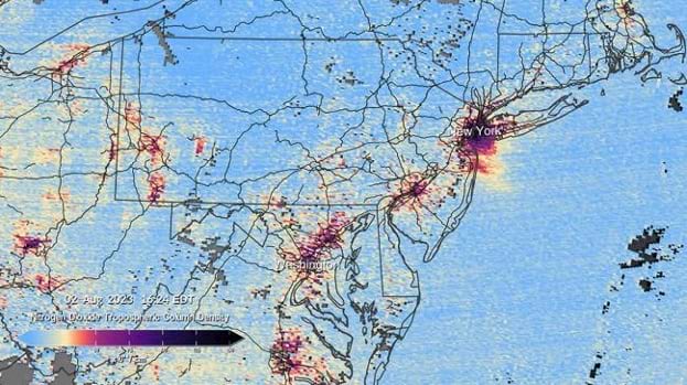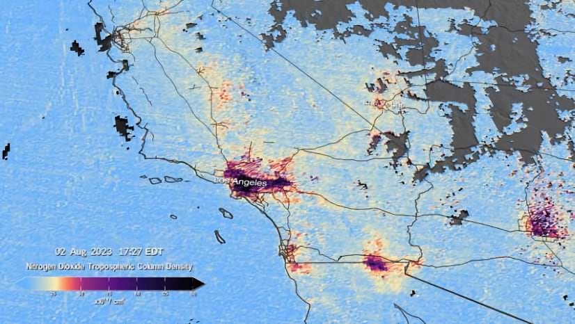Beginning at 11:15 AM Eastern Daylight Time on August 2, 2023, TEMPO scanned the continent every hour for six consecutive hours. This animation shows nitrogen dioxide over the country and zooms in on the east coast, Texas, and Southern California (Video courtesy of NASA and the TEMPO mission).