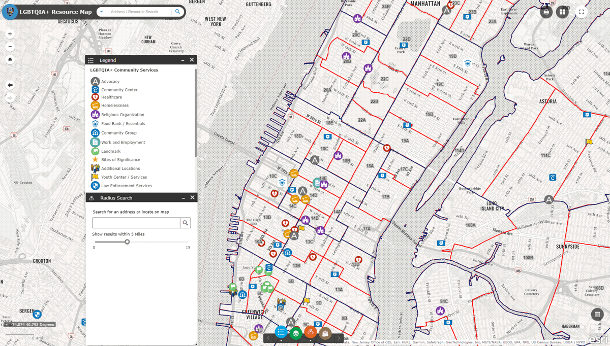Chevallier was hired by NYPD as a GIS analyst and technician, but he’s also interested in social engagement. With this project, he was able to merge the two passions and build an ongoing resource app in collaboration with multiple NYPD bureaus as well as the department’s LGBTQIA+ liaison to the Police Commissioner, Sergeant Ana Arboleda, and LGBTQIA+ outreach unit liaison, Officer Dominick Martorelli.