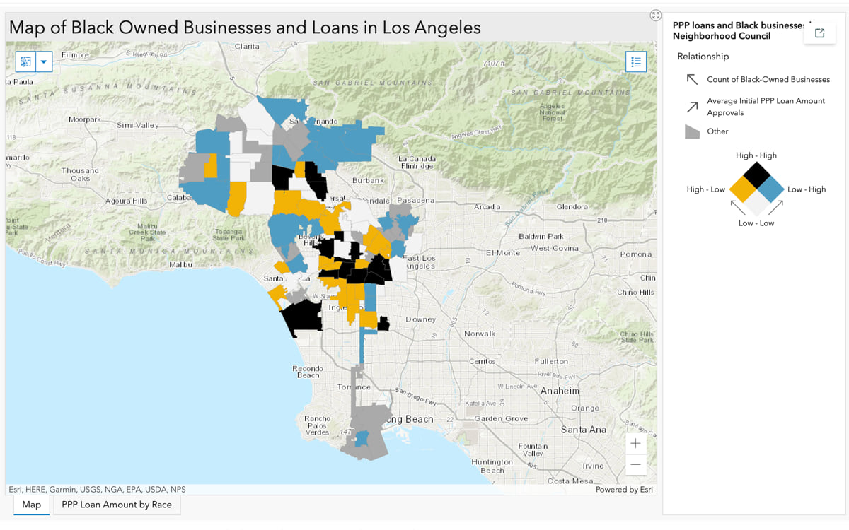 We create a lot of story maps too, when we want to provide context around an issue, such as improving digital inclusion in Los Angeles; mapping Black-owned businesses and PPP loans; evaluating Emergency Rental Assistance; analyzing equity for capital improvement projects.