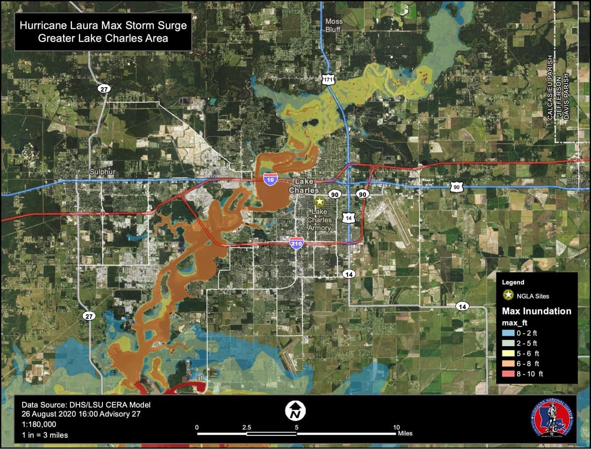 The maps, showing where wind would cause the greatest damage, were developed using models built with a geographic information system (GIS). During Hurricane Laura, the standard storm surge model showed significant flooding for areas near Lake Charles. However, as the hurricane approached land on August 28, 2020, a high-resolution storm surge model coupled with a consequence model revealed high winds as the greatest threat.