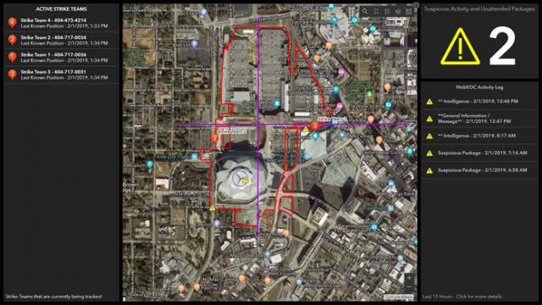 Dashboards displayed the locations of strike teams for the state operations center at GEMA, the bomb management center a few blocks from the stadium, and the Joint Operations Center. During the course of the event, there were 5.5 million requests for just that live data layer alone. That equates to roughly 381 requests per second over the course of the four-hour event, proving that ‘who is where’ is a foundational question.
