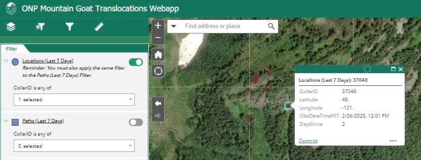 A wave of data this large is essentially worthless without a means to manage and visualize it. Officials involved with the goat relocation program use GIS to display the GPS data on web maps. Because the system works with ArcGIS Online, the web maps and data are easily shared across organizations.