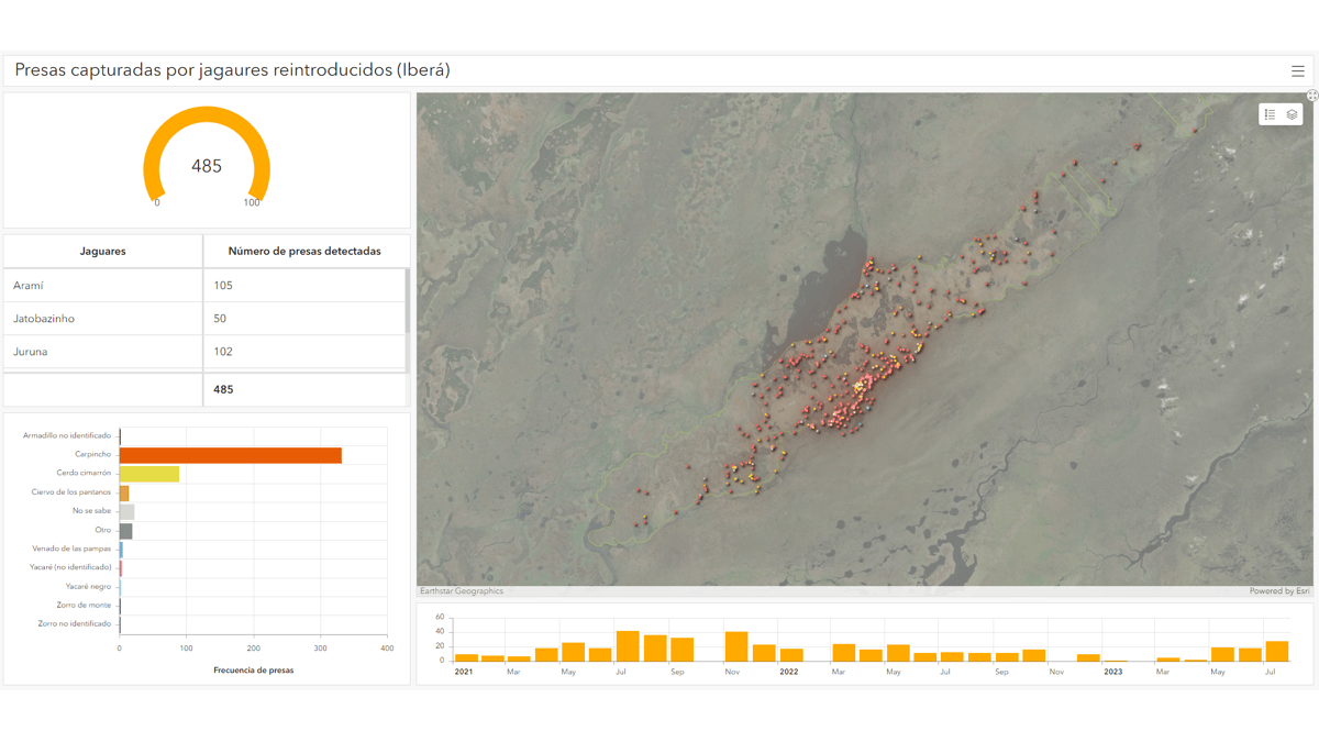 “We are using all these technologies to make the process very quick,” De Angelo said. “Every 20 days or so, we analyze everything. We go into the field to corroborate the number of animals that were the prey of the jaguars. This is useful for two main things—knowing that reintroduced jaguars are doing well and understanding their impact and role on the Iberá ecosystem.”