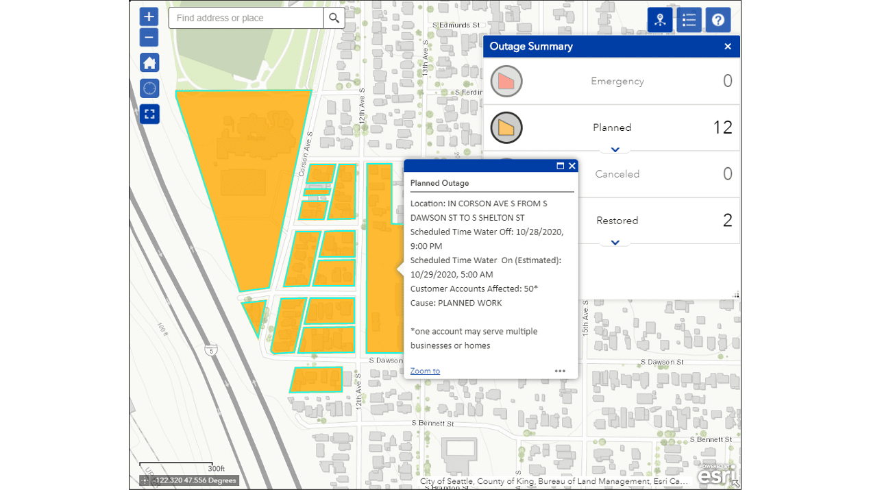 Since launching in June 2020, residents have quickly embraced the self-service outage map. But, at the project outset, the City of Seattle’s GIS team quickly discovered that creating an effective and far-reaching tool would encompass far more than communication via the map. On the back end, the work led to more accurate data, tighter processes for the utility, and overall improvements in the way water shutdowns are managed.