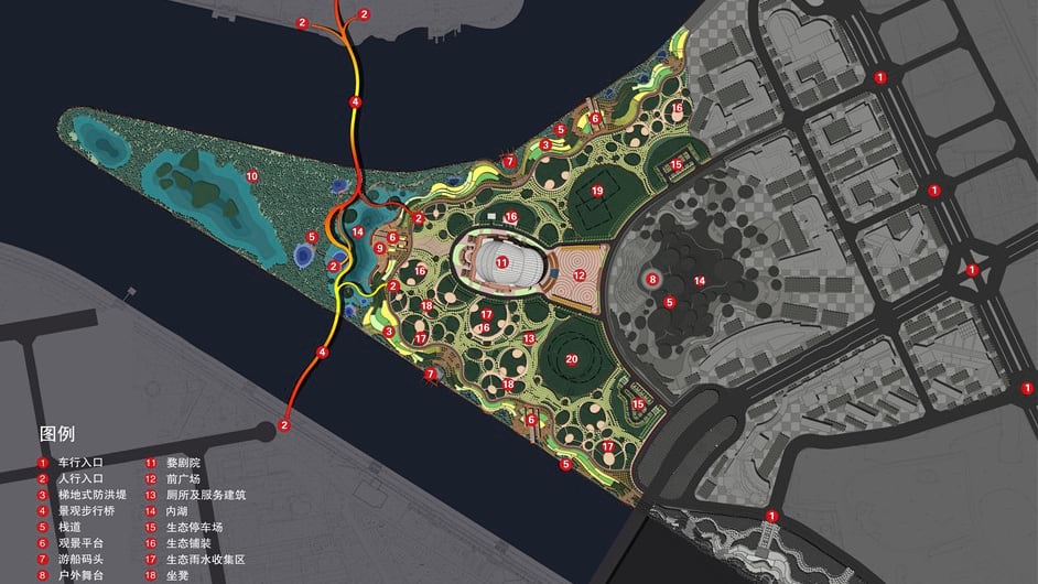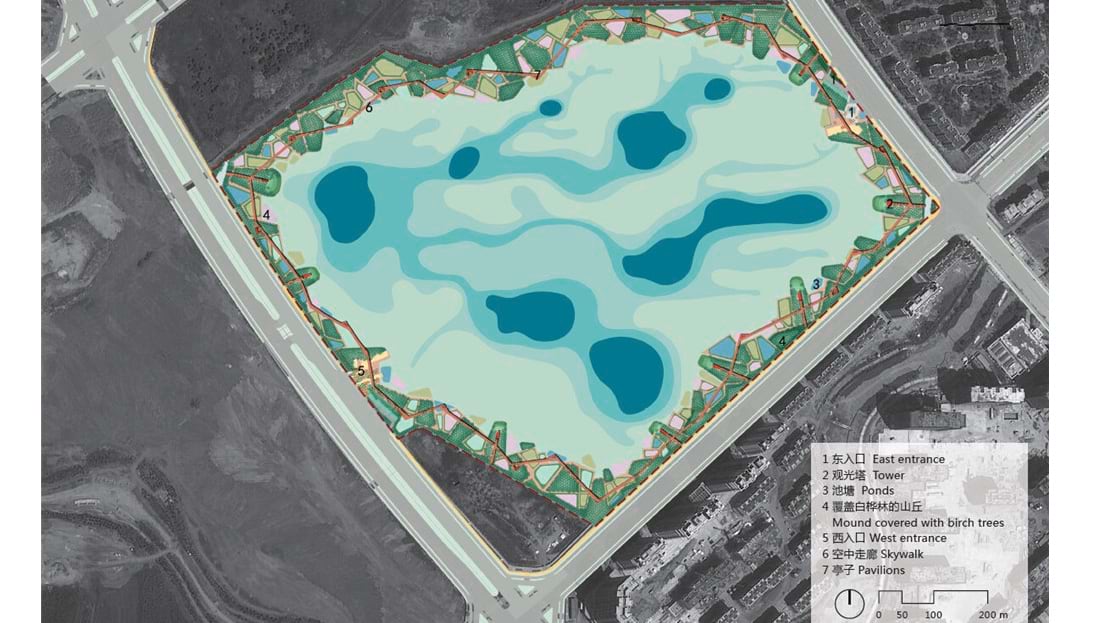 Nature-based designs—ponds, wetlands, and planted landscapes—replace metal and concrete in Yu’s designs. He often chooses to terrace slopes, create ponds, and plant reeds and willows alongside the water, re-creating the landscapes of his youth.