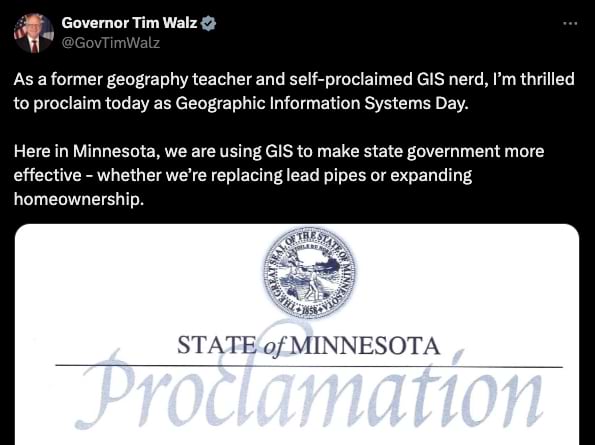 Minnesota Governor Tim Walz understands the power of geography. He has used geographic information system technology, or GIS, to address issues impacting people and places since the 1990s. When he first put floppy discs into his Apple IIe computer to look at data on maps, he became hooked on how GIS technology helped him understand important issues and develop solutions.