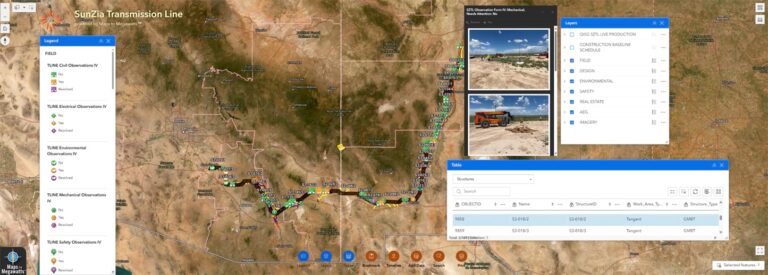 Pattern Energy’s specialists who designed and administer SunZia have been using geographic information system (GIS) technology at an enterprise scale from the start. Teams from all locations use a solution called Maps to Megawatts. Developed by Esri partner Aegean Energy Group, the SunZia Maps to Megawatts ArcGIS Online instance is administered in collaboration with the Pattern Energy Geospatial Technologies team and utilized to create applications to support environmental impact assessments, site selection, transmission routing, and construction.