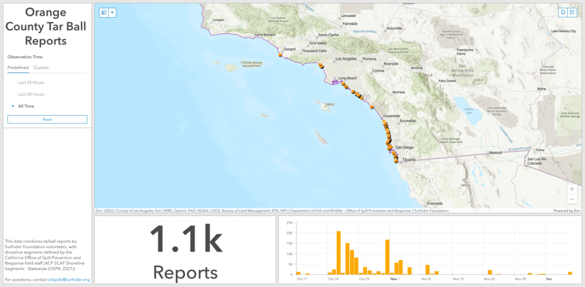 Within a week, the Surfrider Foundation had registered 10,000 volunteers who were directed to the geospatial crowdsourcing Surfrider Tar Ball Reporting App and could start adding pictures and dropping pins where onshore oil removal was needed. Built using geographic information system (GIS) technology and with help from developers at Esri, the app became “a great way to harness energy from the local community,” according to Eric Laughlin, a public information officer for the California Department of Fish and Wildlife. “It was more efficient than receiving individual reports.”