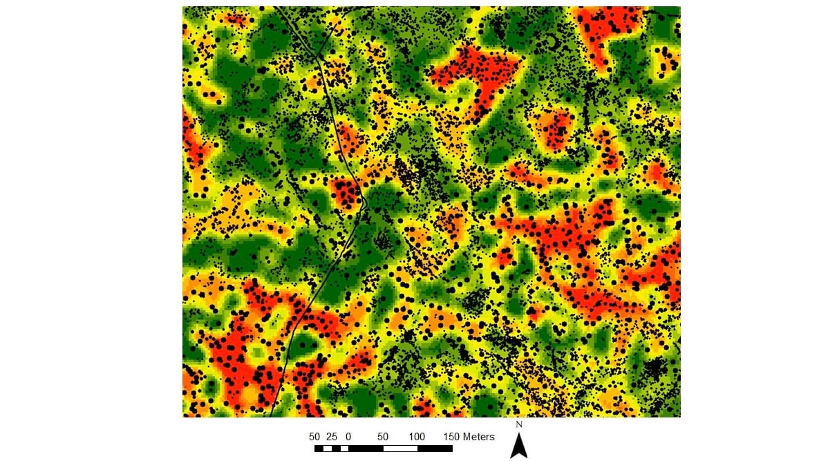 In an old growth longleaf pine community known as the Wade Tract, Tall Timbers researchers and the project founder William Platt have mapped and studied more than 20,000 pines for more than 45 years. The trees have been mapped every few years to track the distribution, height, and health of every individual tree larger than two centimeters in diameter. After a burn, researchers use GPS units to collect location-specific data on how the fire has spread and how it is influenced by the pattern of trees.