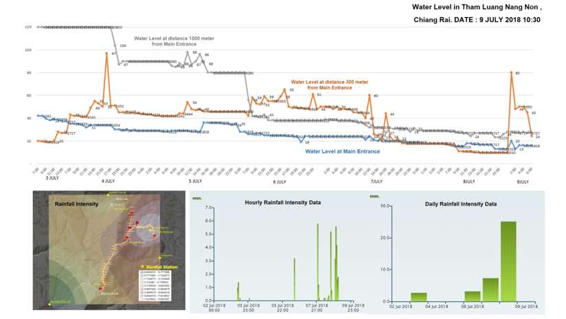 As the mission shifted from search to rescue, the mapping team collected sensor readings on water and oxygen levels at the cave entrance, at 300 meters, and at 1,500 meters. Hourly map updates showed current water depth and air quality, alerting rescuers to changing conditions. The mapping team also monitored weather radar feeds to forecast and understand the volume of rain falling at the surface.