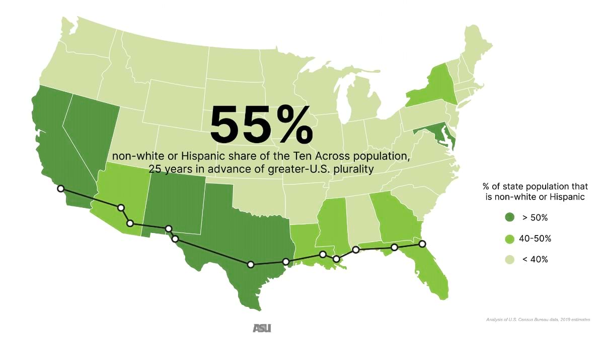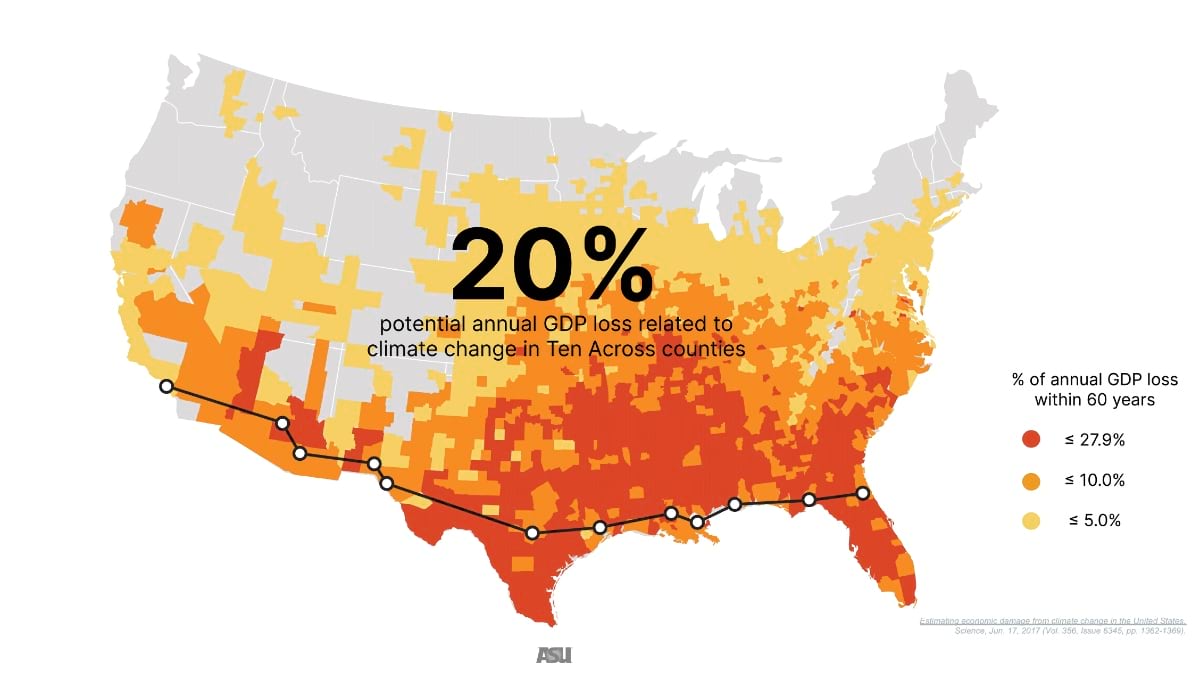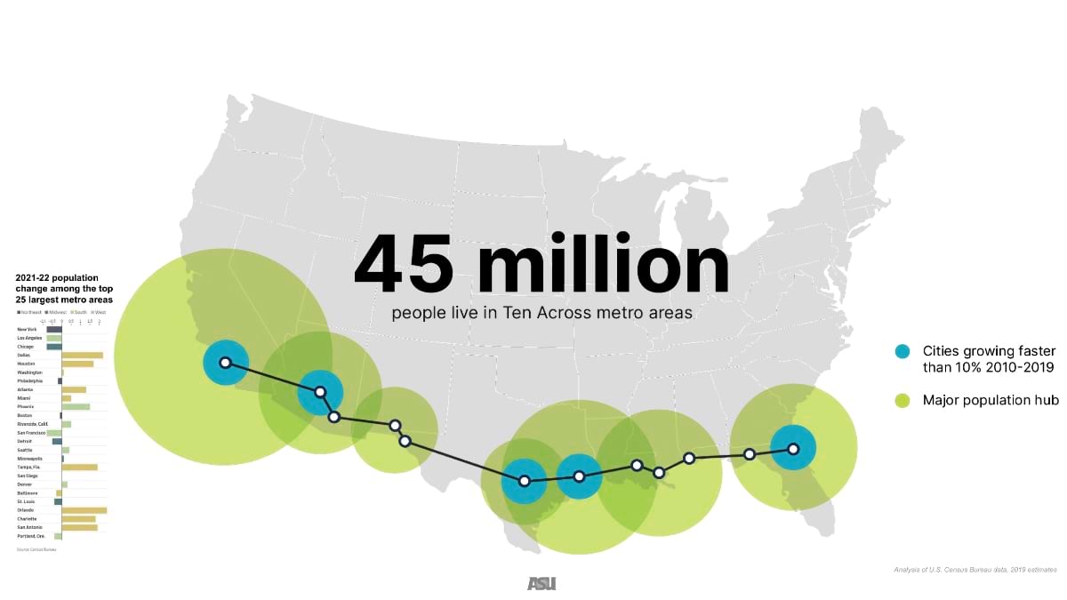 “The 10 passes through the region of the country that is on the front lines of demographic, social, economic, and climate change,” said Wellington “Duke” Reiter, who founded Ten Across an initiative that focuses on the US I-10 region as a living laboratory for resilience and innovation. “The geography may vary but we are confronting many of the same challenges.” Having lived in both New Orleans or in Phoenix, Reiter noticed that “We’re on the same street, in multiple ways, and the fragility of our respective futures connects us.”
