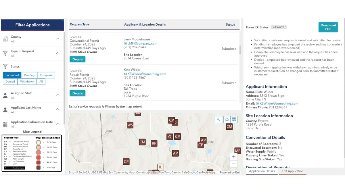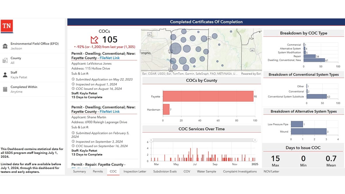 The audit represents a fraction of the work that TDEC permit inspectors do. Complaint investigations, repair designs, and expansion assessments are among the 13 different types of services inspectors deliver each day. To modernize, Owens configured an enterprise GIS to manage the full scope of operational data for those services—from how residents make requests, to how inspectors execute the work and get documentation to the customer, to how management reports progress.