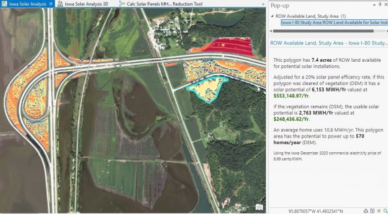 While working with open data from the Iowa Department of Transportation, The Ray began by using GIS to identify and display the state’s 238,000 acres of highway ROW. Various map layers revealed other attributes of interest for choosing the best sites, such as electrical lines.